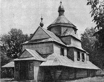 Церква Йоана Хрестителя, 1820 р. Дерев'яна, три-зруб-на, одноверха, центральний зруб ширший за бічні, переходить в комбінований верх - восьмерик на четверику з шатровим покриттям. До східного об'єму зі сходу примикає приміщення, до бабинця піз-ні-ше прибудовано тамбур. Оточена піддашшям на фігурних випусках він-ців зрубів. У компонуванні маси переважає ярусне горизонтальне чле-нування. У інтер'єрі олійний живопис 19 ст. Центральний ви-сот-но розкритий простір сполучено з бабинцем фігурним вирізом. Відноситься до галицької школи народної архітектури. |