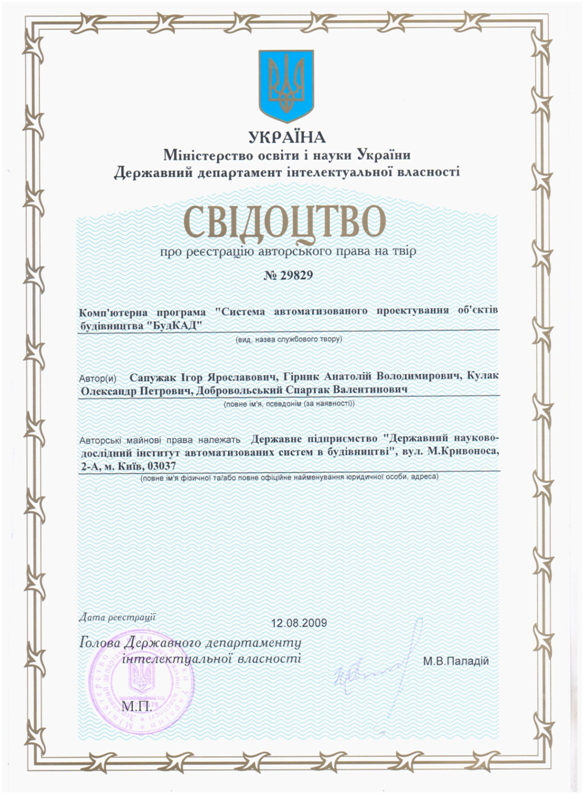 Свідоцтво про реєстрацію авторського права на САПР БудКАД
