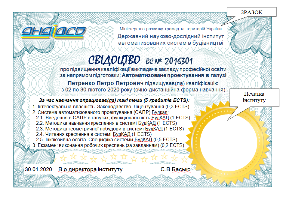 Зразок свідоцтва про підвищення кваліфікації працівників закладів професійної освіти на 2020 рік